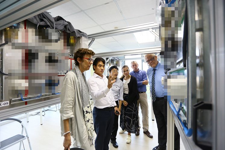 Technical Director Thaison Vu giving the Embassy officials a guided tour in TES Vietnam's facilities. Here, from the certifying room.